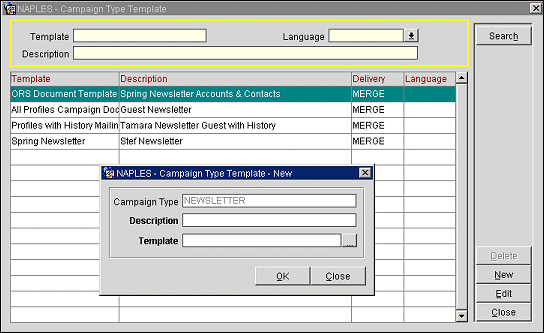 New. Select this button to create a new campaign type template. The Campaign Type Template - New screen appears.