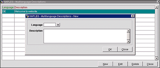 New. Select the New button to select a new language and description for the campaign type. The Multilanguage Descriptions - New screen appears. On the Multilanguage Descriptions - New screen, select the language code to be used. Using the specified language, enter a description of the campaign type.
