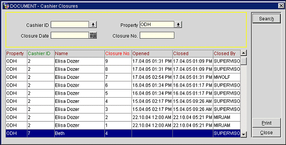 Select Cashiering>Cashier Shift Functions>Reprint Shift Close Reports to display the Cashier Closures screen. Use this screen to reprint selected Shift Close Reports.