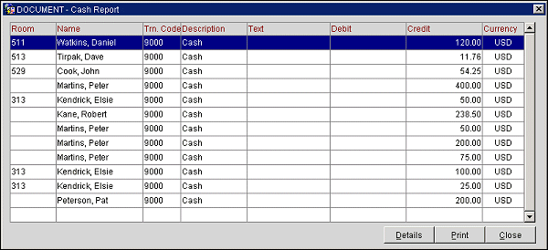 Select the appropriate radio button for viewing and/or printing the report you are interested in seeing. Select the OK button to display the report on-the screen in a grid format. Following is an example of the Cash Report display.