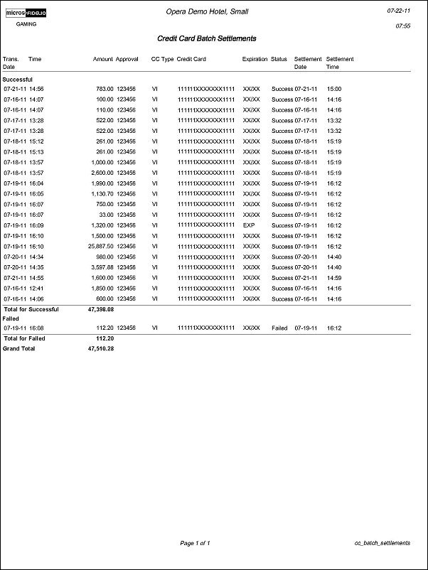 The Credit Card Batch Settlements report displays all the successful and pending Credit Card batch settlements for the selected transaction date, in case of End of Day, the business date being the transaction date.