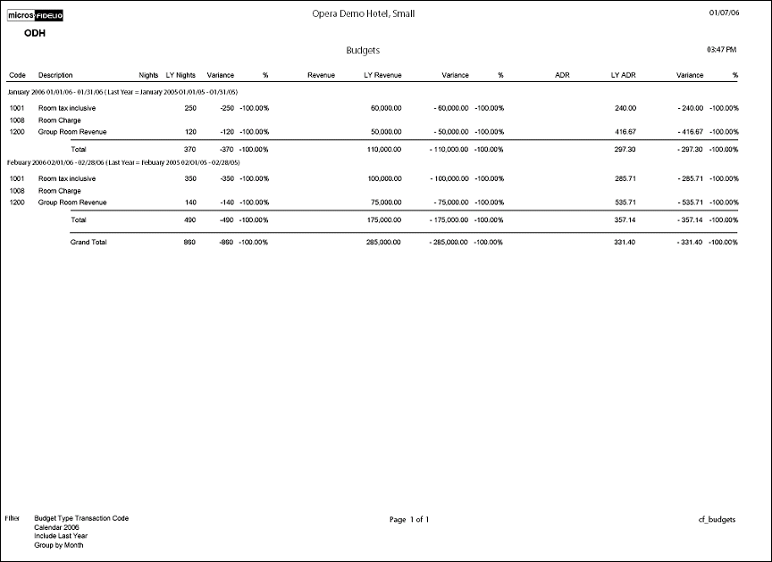 The Configuration report for Budgets will display the budgets that have been configured in the application for your property. The attached form allows for filtering on the defined budgets and for a specified items.