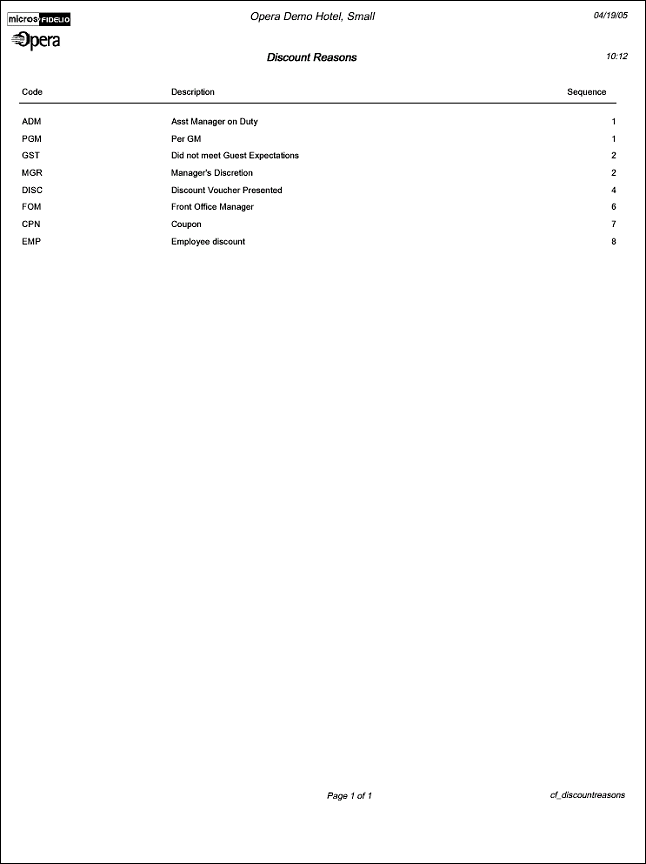 The Configuration report for Discount Reasons will display all Discount Reasons that have been configured. When either a discount amount or percentage is given on a reservation, the user must select a discount reason of why this discount was given.