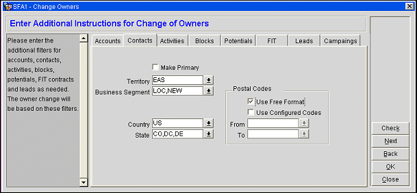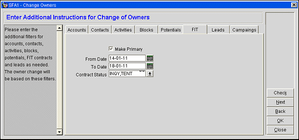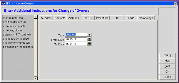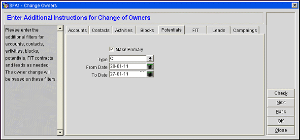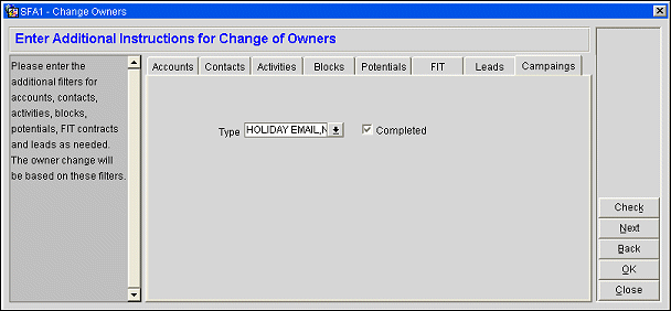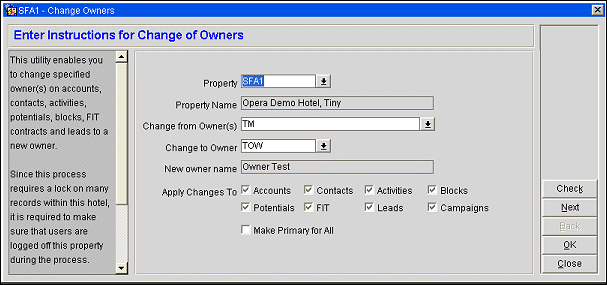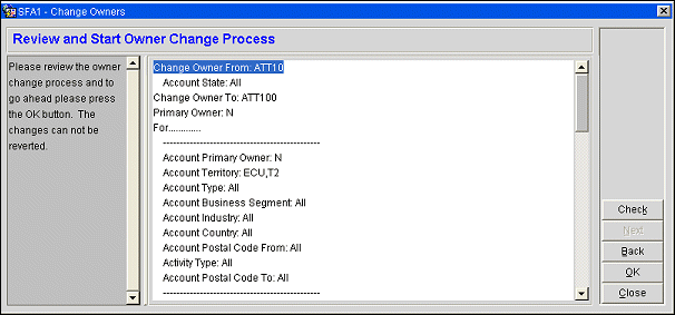 Change to Owner. Select the sales manager owner to whom the accounts, contacts, activities, bookings, etc. will be reassigned. The name of the owner you select appears in the To Owner Description field.