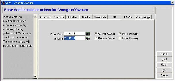 Change from Owner. Select the down arrow to choose the sales manager owner(s) from whom you wish to unassign accounts, contacts, activities, bookings, etc. If this field is left blank, all accounts, contacts, activities, bookings, etc., that do not have an owner association will be assigned the Change To Owner as primary owner.