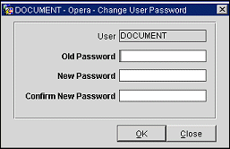 You are prompted to change your password when you log into OPERA for the first time, when your current password expires based on the number defined for the Password Expiry Days in User Configuration, and when your password has been changed for any reason by the system administrator. You may also elect to change your password at any other time by selecting Miscellaneous>Change Password from the OPERA main menu bar options.