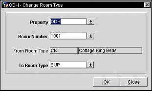 The Change Room Type to Another Room Type utility allows for a properties' specified room type(s) on rooms, blocks, and reservations to be changed to another configured room type. Running this routine will update room types for in-house reservations and blocks, and reservations and blocks whose arrival date is the current business date or a future date. Room type is not changed on reservations or blocks for a past date.