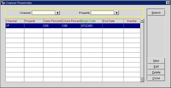 The Channel Thresholds grid displays the thresholds already setup based on the parameters you entered in the search criteria. Select the Edit button to edit an existing threshold, or select the New button to create a new threshold. Select the Delete button to delete an existing threshold.