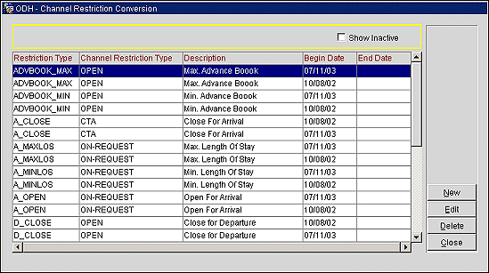 Use the channel restrictions conversion screen to map OPERA restriction types to the GDS/ADS equivalent.