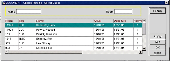 The Charge Routing - Select Guest screen allows you to search for and choose the guest to whom postings for the selected transactions will be charged when you are setting up transaction routing instructions. The screen appears when you select the down arrow next to the Route to Room field on the Routing Instructions screen. The screen also appears when you are setting up package allowance routing.