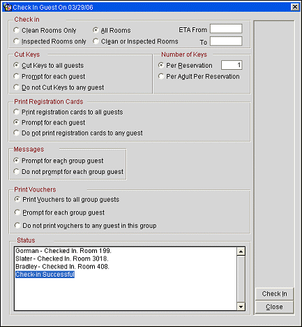 The Check In screen allows you to select the check-in process options to be applied to the reservations being checked in.