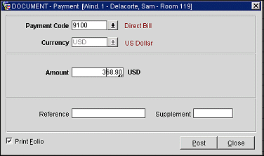 Note: If only part of the guest's expenses are being handled by direct bill, you may wish to move these transactions to a separate Billing screen window; you may then process payment for this window using the direct bill payment method.