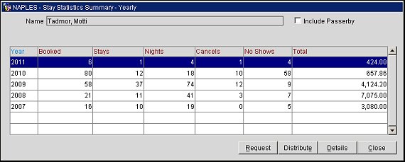 The Stay Statistics Summary - Yearly screen is a year-by-year overview of stay information for the current profile. The summary includes booking activity at all properties. "Drill down" features allow you to focus on a specific year, a specific property, and individual stays.