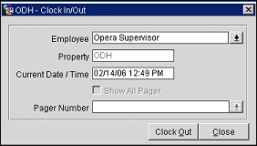 Pager Number. Available when the OPP_PTM PMS add-on license is active. For clock-in, select the down arrow to choose the pager number clocking in. Not available for clock out.