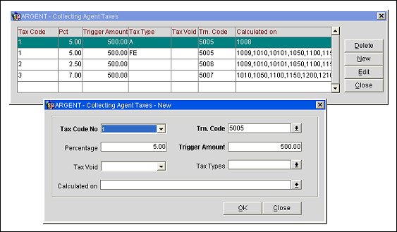 Calculated On. Select the down arrow to choose all transaction codes or subgroups that will be involved in the calculation of the collecting agent tax.