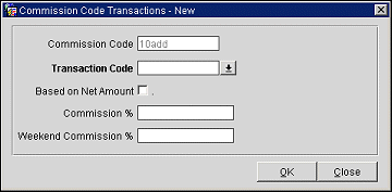 To add new transaction codes to the commissionable list, select the New button. To make changes to the list of commissionable transaction codes, highlight your choice and select the Edit button. The Commission Code Transactions - New or Commission Code Transactions - Edit screen appears.