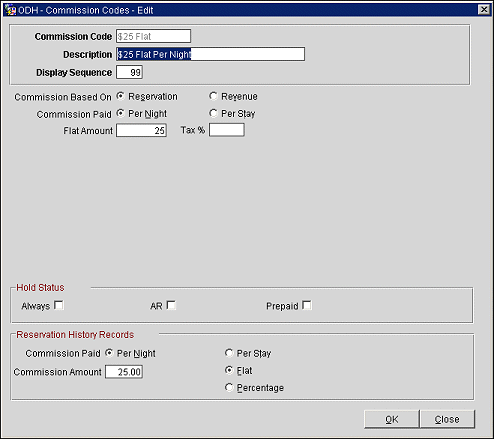When commission detail records are created using this commission code, they can automatically be placed on hold as they are transferred to the commissions module upon the guest's departure. (See Commission Payment Processing for details.)