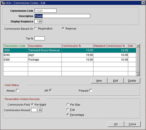 Commission Based On. The Commission Codes screen fields are different depending on whether the commission code is based on a flat amount per reservation (select the Reservation radio button) or on a percentage of revenue (select the Revenue radio button) associated with the reservation.