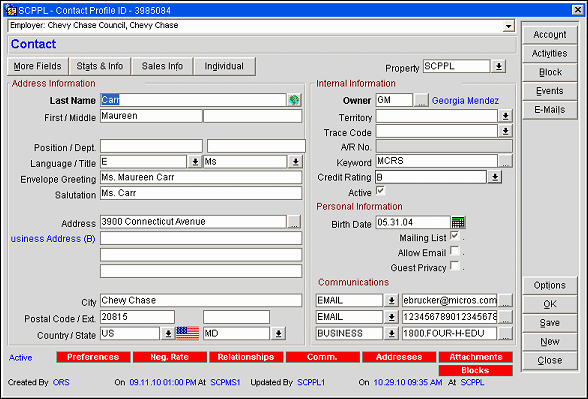 The Contact tab becomes active when the Contact check box is selected on the Profile screen for an individual profile type. This screen includes information related to the individual's business relationship with one or more accounts. A contact profile can also be created directly from within an account by selecting the ellipsis button next to the Contact field on the Business Block screen (See Business Block Screen and Quick Profile for details) or from Sales & Catering by selecting Customer Management>Contacts.