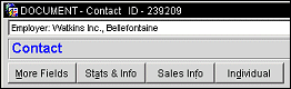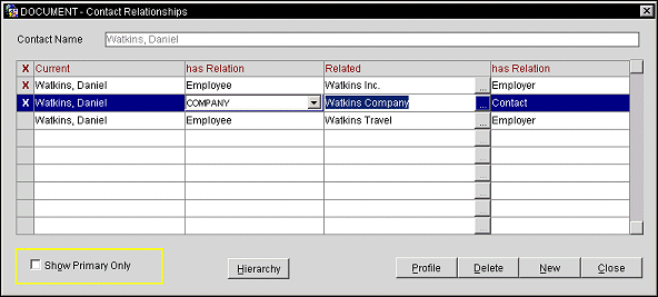 The Contact Relations screen lists the relationships that have been set up for the current contact profile. One relationship may be designated as the primary relationship. The primary relationship has an X in the Primary column. The primary relationship will be displayed at the top of the contact's Profile screen as shown below. The primary designation can be used in preparing reports on profile relationships.