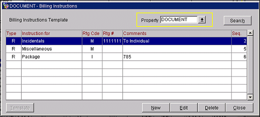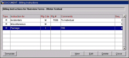 To create new billing instructions for the template select the New button. To edit a contact billing instruction, highlight your choice and select the Edit button. The New Billing Instruction Template screen or the Edit Billing Instruction Template screen appears.