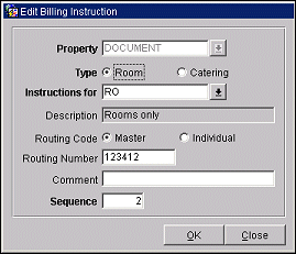 Routing Code. Select the down arrow to choose a routing code. Options are Master (M) to indicate billing that is charged to a posting master; or Individual (I) for billing charged to an individual's folio. This is for informational purposes only and does not influence the OPERA Routing Instructions for this business block.