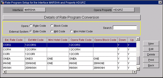 Rate Code/Block Code Conversion (MARSHA only) - If a pick-up from a block is made in PMS, the PMS block code must be sent to MARSHA for the recognition of that reservation as a group reservation. This is done through the rate/block code conversion table, where users have to enter newly created PMS block codes linked to the rate codes they are using with that block. During upload, the table is evaluated and if the rate code found has a block code linked to it, the message is sent as a group booking to MARSHA. The corresponding Mini hotel component is used for upload only. In this case a block code has to be uploaded to the CRS although the reservation is not attached to a block in PMS.