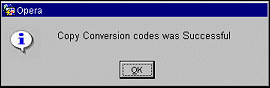 To select conversion codes for the new interface first, go to Interface Configuration>Conversion Codes. Select all conversion codes that will be applicable and activate them. Once done, exit and return to the Copy Conversions screen. You can select all tables at once or a few at a time to copy ORS conversion codes to the interface. It is suggested to do all at once for the initial installation. When you select to copy the conversion codes from the tables in OPERA, the following message will appear. Select OK.