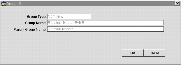 When creating a new group, select New from the Groups screen. In our example, select the Group Type (Company), the Group Name which you are adding to the tree (Relation Master Neuss) and the LOV for Parent Group (the name is the Group Name initially created, however, once applying the OK button the user will be able to actually select the Parent Group Name from the Tree.)