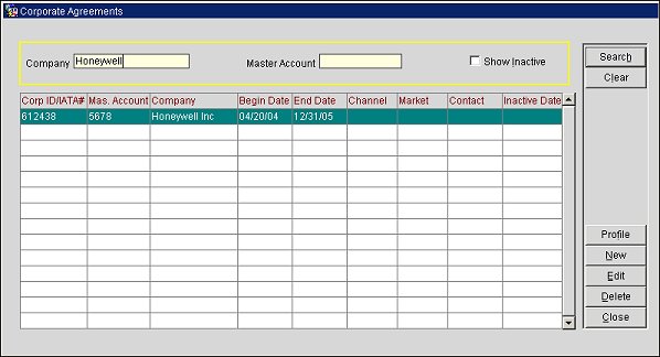 The Corporate Agreement list appears when Profiles>Corporate Agreements is selected. At this screen, you can search for and view a company with corporate agreements. You can also select various function buttons to view, edit, and create corporate agreements.