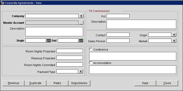 To set up a new corporate agreement, select the New button from the Corporate Agreements screen. The Corporate Agreements - New screen appears. Enter the required fields in this screen, highlighted in bold. Select Save when you are through. More instructions are below.
