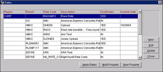Note: To associate the rates to the region and properties, at the Rates screen, highlight the new property and select the Apply Rates button. The rates are distributed and the Distribution status is YES.