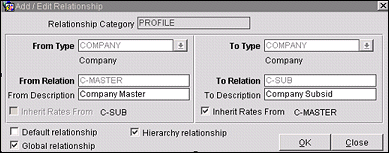 Configure Company Relationship Types as Hierarchy and Global, with Inherit Rates selected in order to Transfer via the Interface. This is done by accessing Configuration>Profiles>Relationship Types. Refer to Relationship Types for more information.