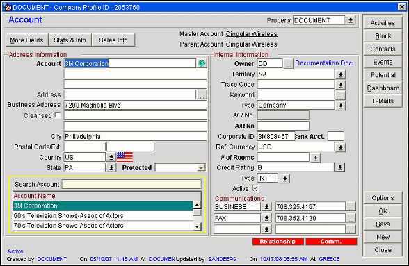 Otherwise the Account screen will be for the type of account shown in the View By field (Company, Travel Agent, Source, or Vendor).