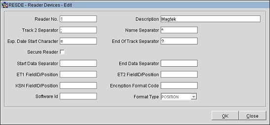 Reader No. Enter a credit card reader device number. This number will be used when assigning the credit card reader device to use with the workstation.