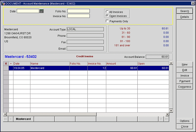 The Invoice Details screen (highlight the invoice and select the Invoice button on the AR Account screen) shows the individual transactions that are covered by the invoice.