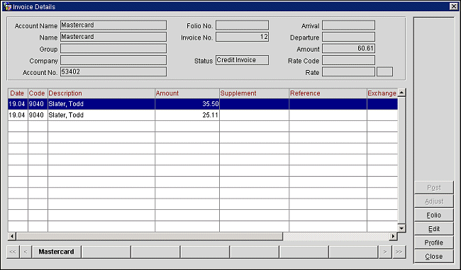 All transactions associated with a particular credit card transaction code that are transferred together will be grouped and shown as a single invoice. Once transferred, the consolidated transactions for each credit card company will be shown on the AR Account screen for their respective company accounts with an invoice number assigned.