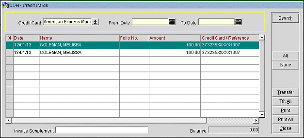 This screen lists folios for guests who checked out using a credit card payment transaction code that has an AR account associated with it. It also lists payments made prior to check out if the payment was made using a credit card transaction code that has a an AR account associated with it. From this screen you may transfer one or more folios and payments (referred to as "transactions") to the appropriate credit card company AR accounts. See Transferring Credit Card Transactions to AR, below.
