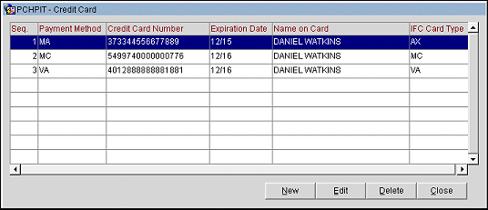 Note: You may not create, edit or delete credit card records from the Credit Card screen when it is presented for selection of a payment method.