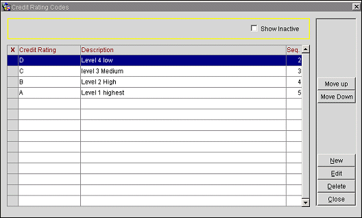 Show Inactive. Select this checkbox to display inactive credit rating codes. Otherwise, active credit rating codes display.