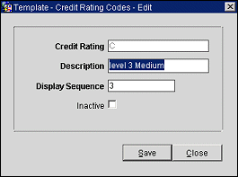 Edit. Select this button to edit the highlighted credit rating. The Template - Credit Rating Codes - Edit screen appears.