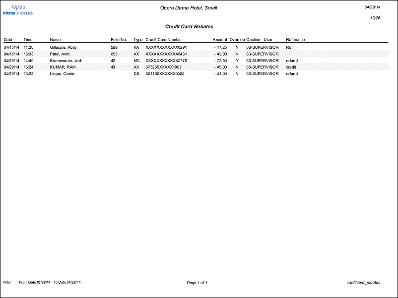 When the CASHIERING>CREDIT CARD REBATE VALIDATION application parameter is set to Y, then the Credit Card Rebates report displays credit card rebate overrides. The date, time, name of the credit card holder, folio number, credit card type, credit card number, amount, override (Y/N), and the cashier/user who entered the rebate are displayed on the report.