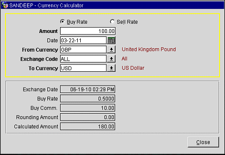 Buy Rate. (Available when the Buy Rate radio button is selected.) Currency exchange buy rate configured for the currency in the From Currency field.
