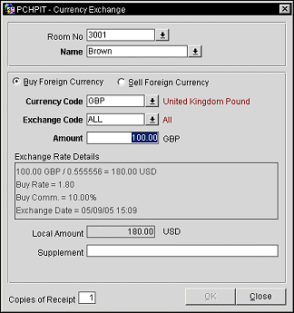 Currency Code. Enter the code for the type of currency the guest wishes to exchange. Or select the down-arrow to display the Currency LOV from which you may choose the currency code. The description of the currency selected displays next to the field.