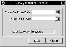 Start. Begin the transfer status. The program will collect the data and write it to a file as the message Revenue transfer in process, please wait displays. The Transfer dialog box closes automatically when the transfer has completed. Once the system has completed the transfer, you are returned to the main menu. If, for some reason, the transfer could not be completed, an appropriate message is displayed. The interface always transfers revenue records one day at a time This means that if you need to transfer records for various days (for example, after a weekend), you will need to select this menu option several times, once for each consecutive day. The system will not allow you to skip days and always defaults to the date of the last transfer plus one.