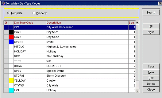 When the OPP_MHOT Multi Property PMS add-on license is active, you may set up day type codes using the Template radio button option, then copy the day type codes to one or more properties. (See Copying Day Type Codes to Other Properties, below.) To see the day type codes for a specific property, select the Property radio button. The select the property from the Property field drop down list. The current login property is the default.