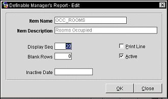 Display Seq. Number indicating the relative position of the item in the report. Items with lower sequence numbers appear before items with higher sequence numbers. (You may also change the position of an item in the report while working from the Definable Manager's Report screen. To do so, highlight the item and use the Up/Down arrows. OPERA will automatically change the display sequence number.)