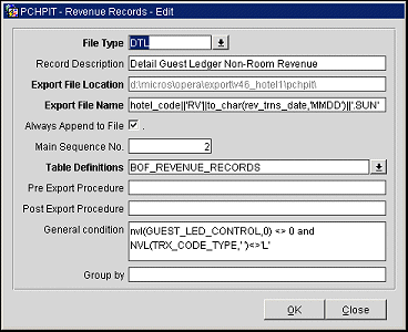 Export File Name. This is the definition of the export file name. This should be a valid SQL formula returning a character value. For example: 'RV'||to char(rev trns date,'rrrrmmdd')||'.txt' would create a filename of RV20010214.txt for a revenue transfer for Feb 14, 2001. Similarly, a file name of mkt trns date can be used for market statistics export, sta trns date can be used for daily statistics export, and city trns date can be used for city ledger exports to get the current export date.
