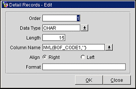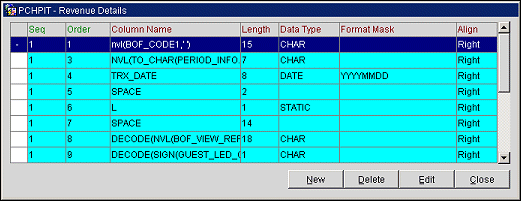 Display the details of the information that will be exported. The steps from this point forward will require information from the third party accounting system on the file specs that are required, as well as a good understanding of SQL and the OPERA database. At this point you will be creating the valid expression that enables you to retrieve the required data from one of the OPERA files. During the creation of the transfer file, these expressions will be carried out in the order of their Sequence and will build the export file.