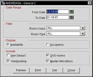 Room Class. Multi select LOV for filtering on specific Room Classes. The Room Class filter is only displayed when the GENERAL > ROOM CLASS application function is active.